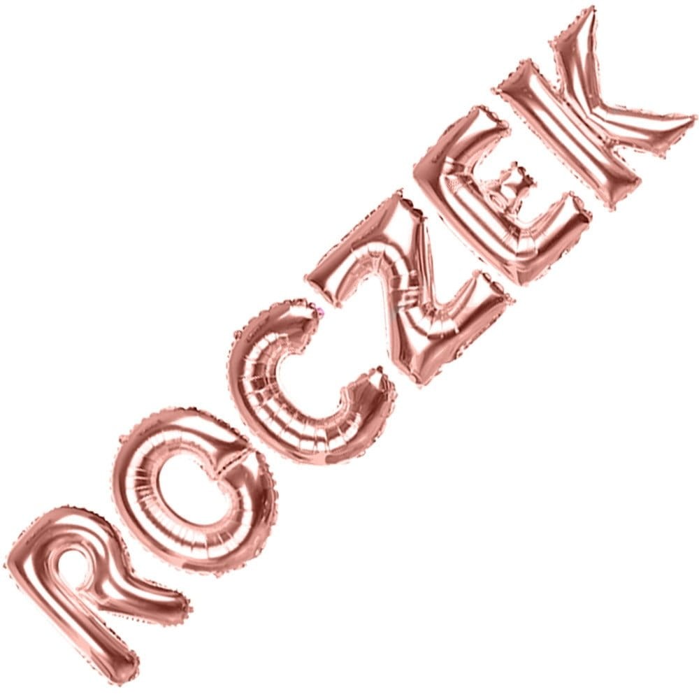 Opakowanie zawiera 6 balonów foliowych w kolorze różowego złota. Balony tworzą razem duży napis ROCZEK. W opakowaniu znajduje się również rurka ułatwiająca nadmuchanie balonów.