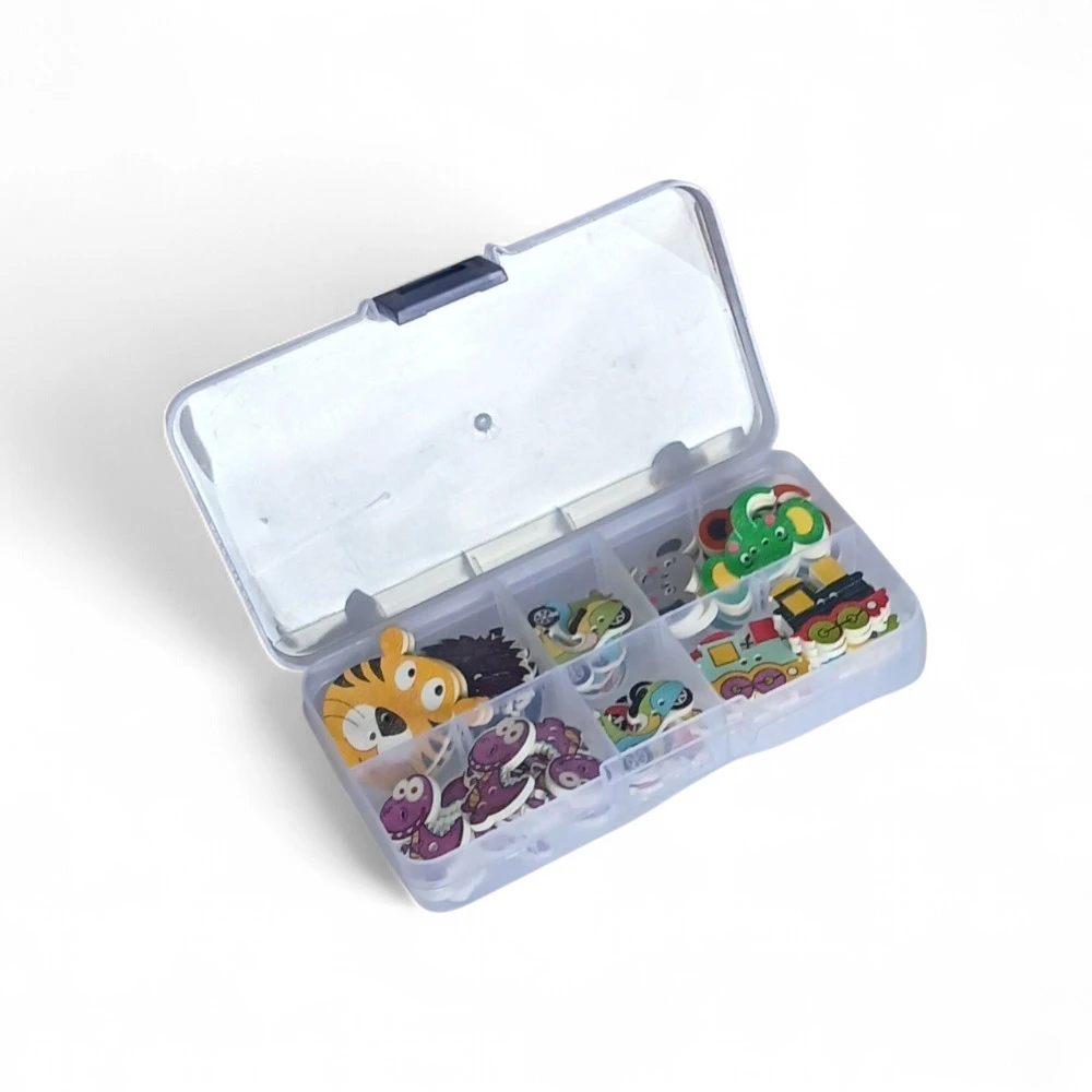 Zestaw drewnianych guzików w różnych kolorach, kształtach i rozmiarach. Motywy na guziczkach z pewnością przypadną do gustu każdemu dziecku. Po jednej stronie posiadają kolorowy nadruk. Całość w praktycznym, plastikowym organizerze.