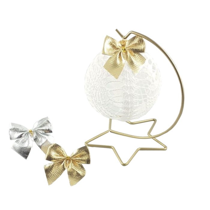 Prezentowany na fotografii szydełkowa bombka z zawieszką i stojakiem jest tylko przykładem wykorzystania kokardki i nie podlega sprzedaży. Stojaki i zawieszki do bombek, kupisz w naszym sklepie osobno.