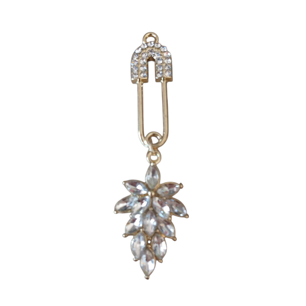 Piękna, elegancka przywieszka w kształcie, złotej, wysadzanej cyrkoniami agrafki z listkiem z czarnych kryształków. Zawieszka będzie piękną ozdobą torebek, ubrań, możemy z niej wykonać broszkę / wpinkę do damskiej marynarki, albo dołączyć bigle i zrobić piękne kolczyki.