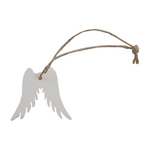 Drewniane skrzydełka malowane na biało z zawieszką ze sznurka jutowego. Skrzydełka mogą stanowić samodzielną ozdobę lub posłużyć jako półprodukt do wykonania własnych aniołków szydełkiem lub techniką makramy.